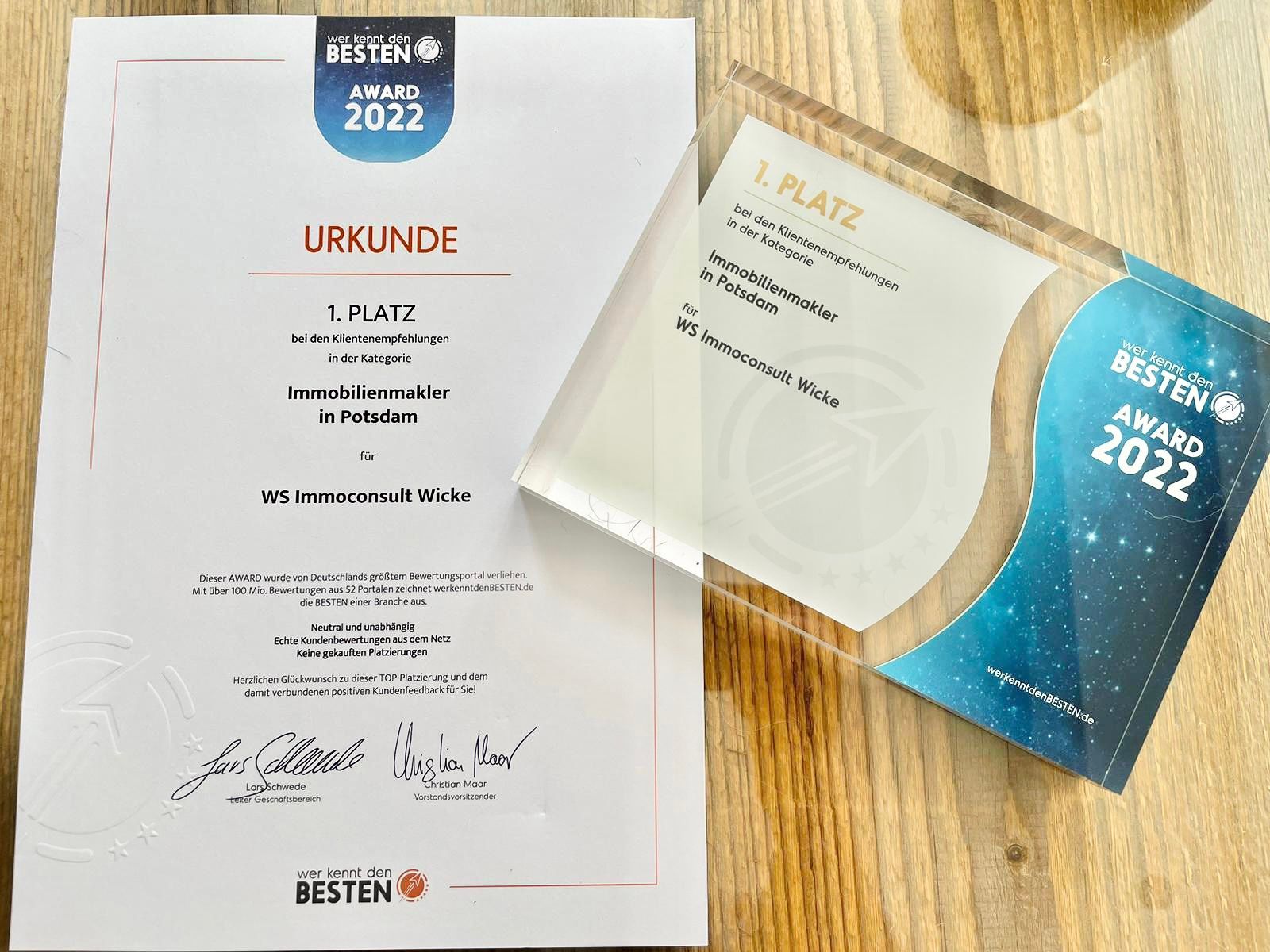 Mit großer Freude durften wir heute etwas verspätet den rückwirkenden Award für das Jahr 2022 für den 1. Platz bei den Klientenempfehlungen in der Kategorie "Immobilienmakler in Potsdam" entgegennehmen, verliehen durch werkenntdenBESTEN.