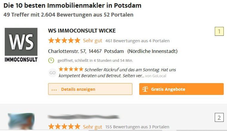 WS IMMOCONSULT WICKE aus Potsdam erhält Spitzenplatz von Deutschlands größtem Vergleichsportal!
