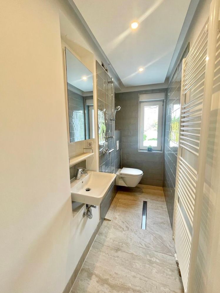 Das elegante Badezimmer besitzt eine große Badewanne mit Glas-Duschabtrennung sowie ein modernes Hänge-WC, Waschbecken, eine Waschmaschine und eine schöne, dezente Feinstein-Fliese.